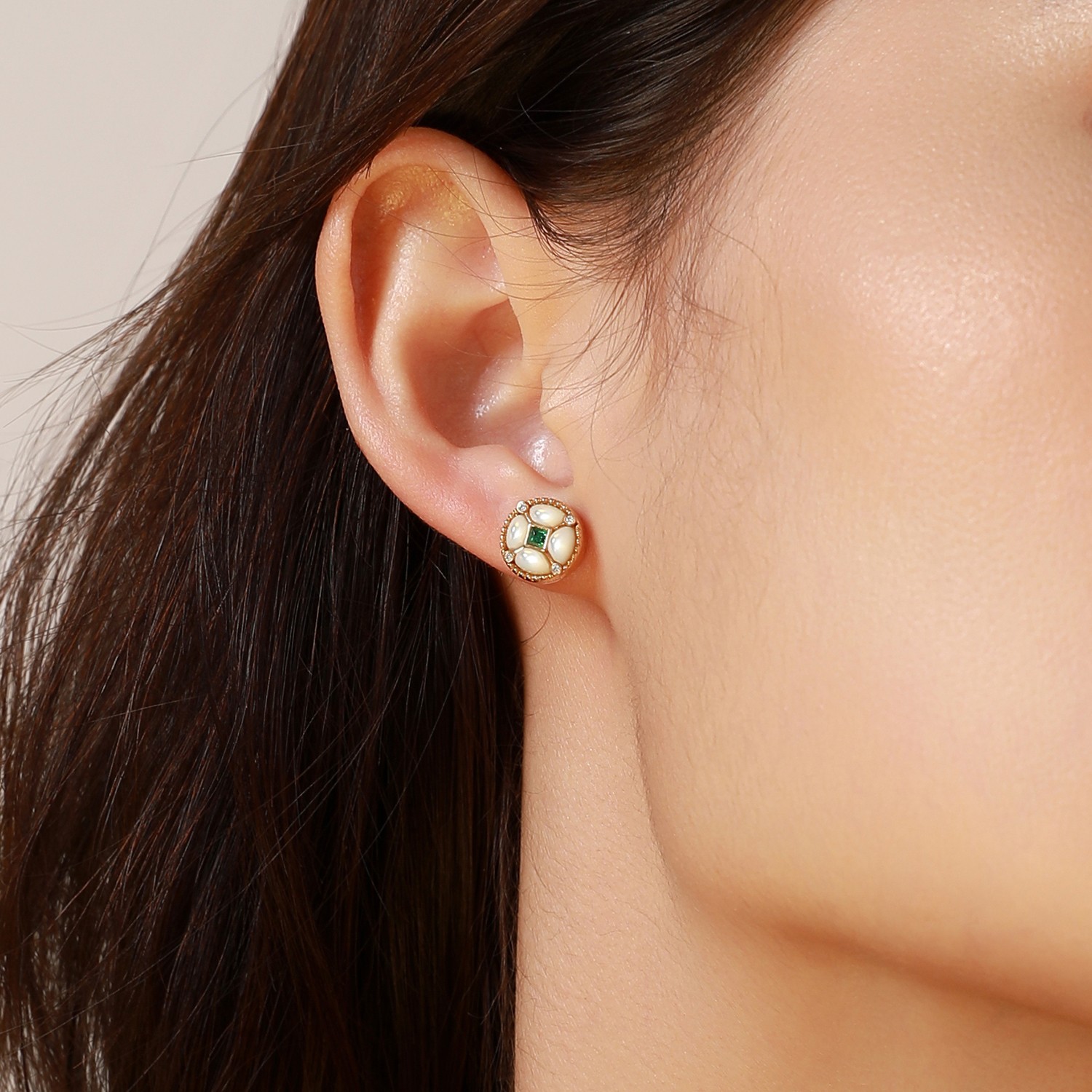 These stud earrings exhibit a blend of classic allure and contemporary design. Crafted from 18K gold, they feature a lustrous mother-of-pearl backdrop, beautifully accented by a central emerald. Tiny diamonds encircle the gemstones, enhancing the intricate details and the overall elegance. Ideal for adding a touch of sophistication to any look, they embody the essence of refined luxury.