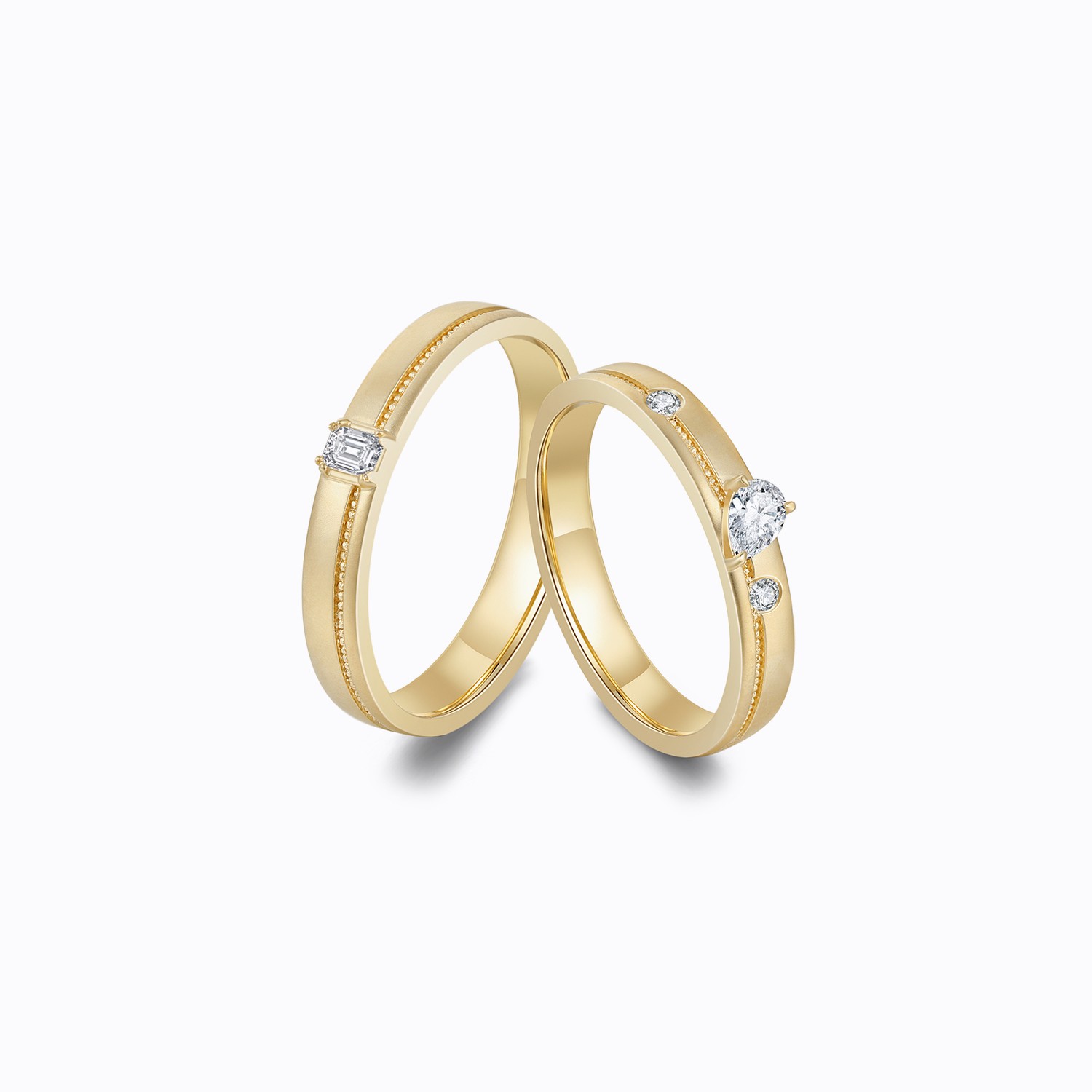 Celebrate your love with these timeless 18k gold wedding bands, each adorned with a stunning solitaire diamond. The classic design, featuring a sleek and polished finish, radiates elegance and sophistication. Perfect for couples who appreciate enduring beauty and a touch of brilliance in their symbol of commitment.