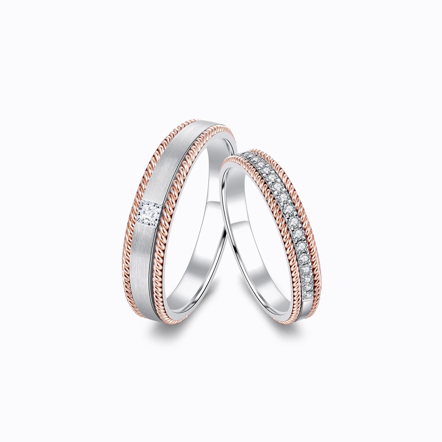 Indulge in the exquisite blend of 18k rose gold and 18k white gold with these dazzling couple rings. Adorned with intricate diamond accents and a unique dual-tone design, these rings are the perfect symbol of your sophisticated love and timeless commitment.