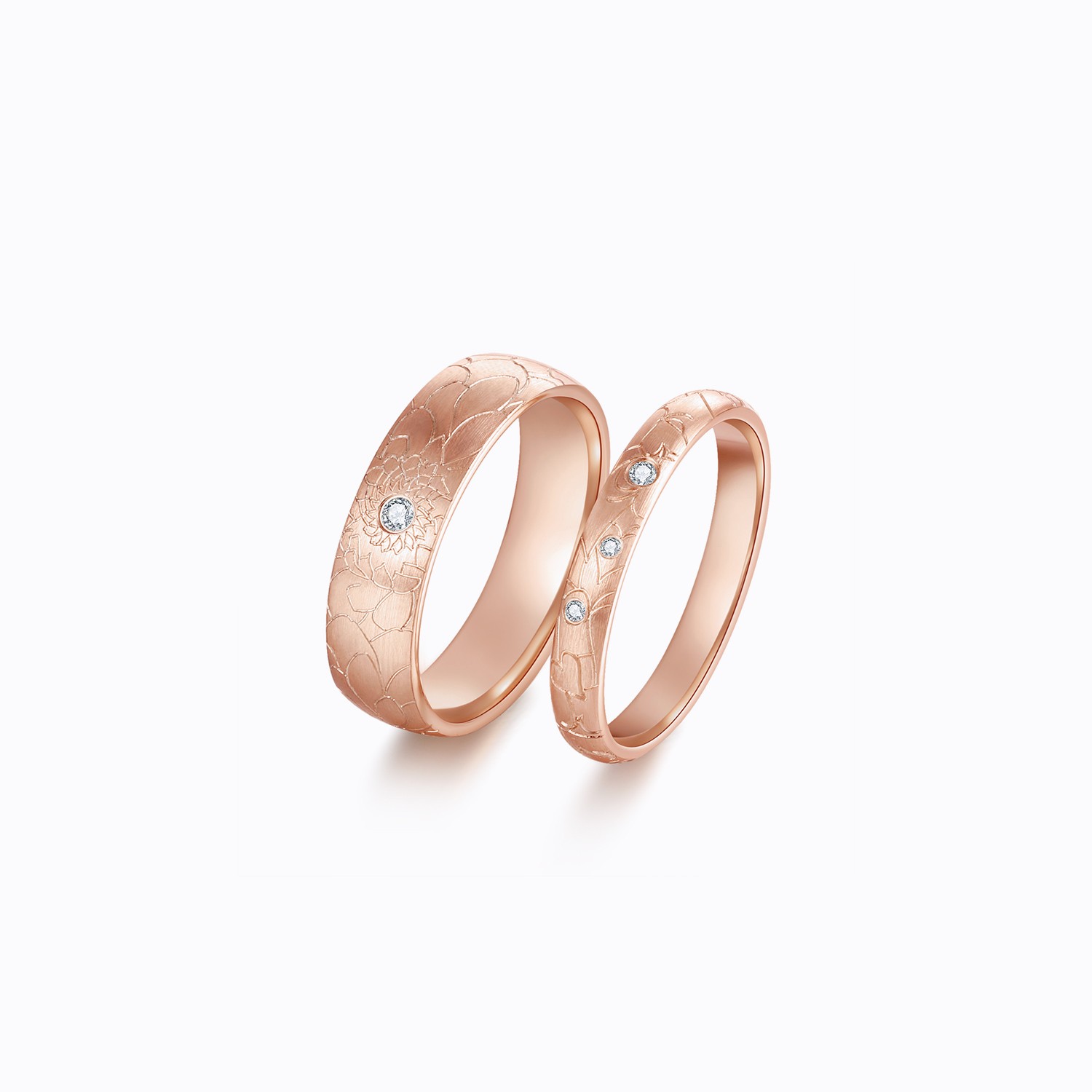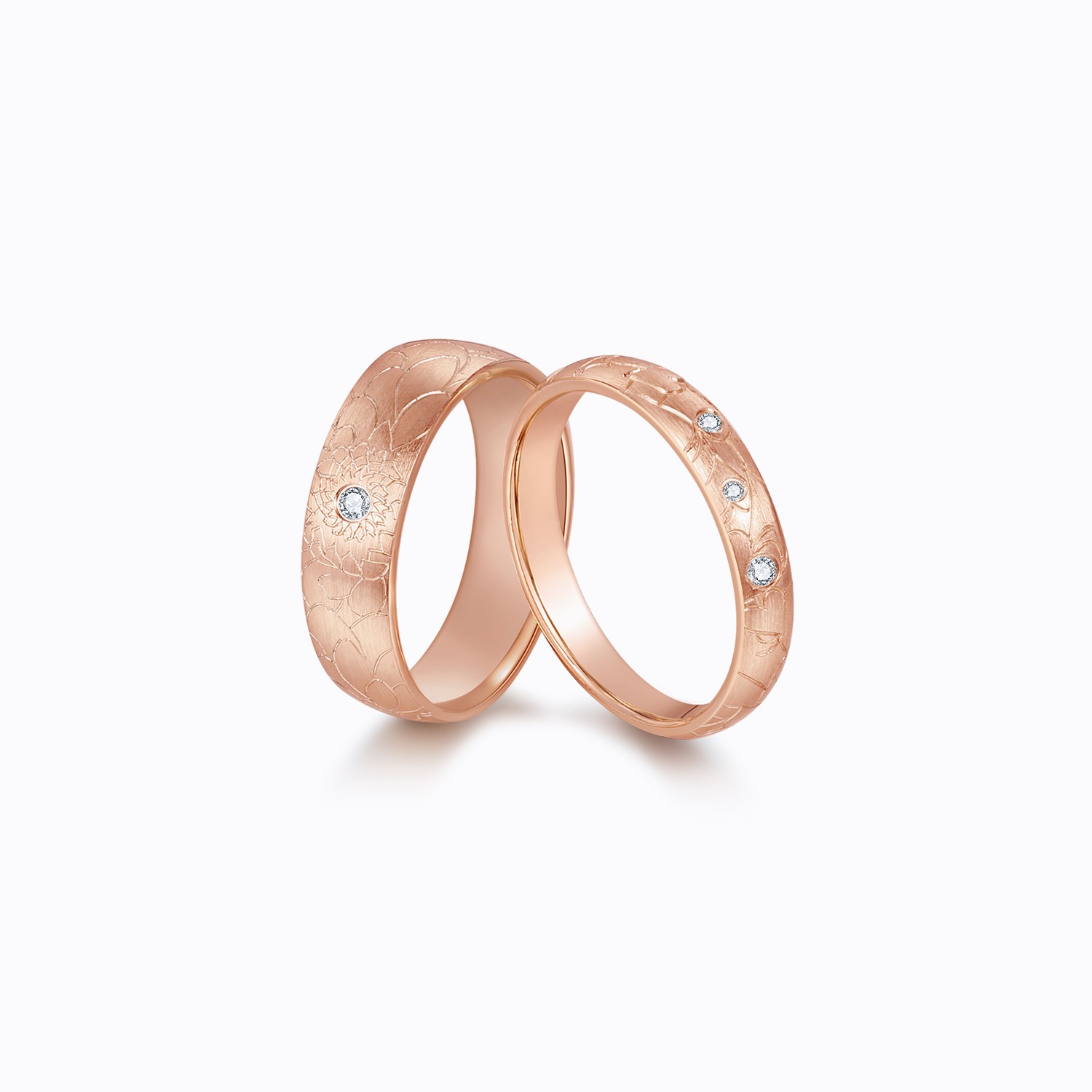 These couple rings in 18k rose gold feature a modern design, accented with brilliant diamonds. The men’s ring is bold yet refined, and the women’s ring is elegantly detailed, making them perfect for couples seeking a contemporary symbol of their union. Ideal for engagements or anniversaries.