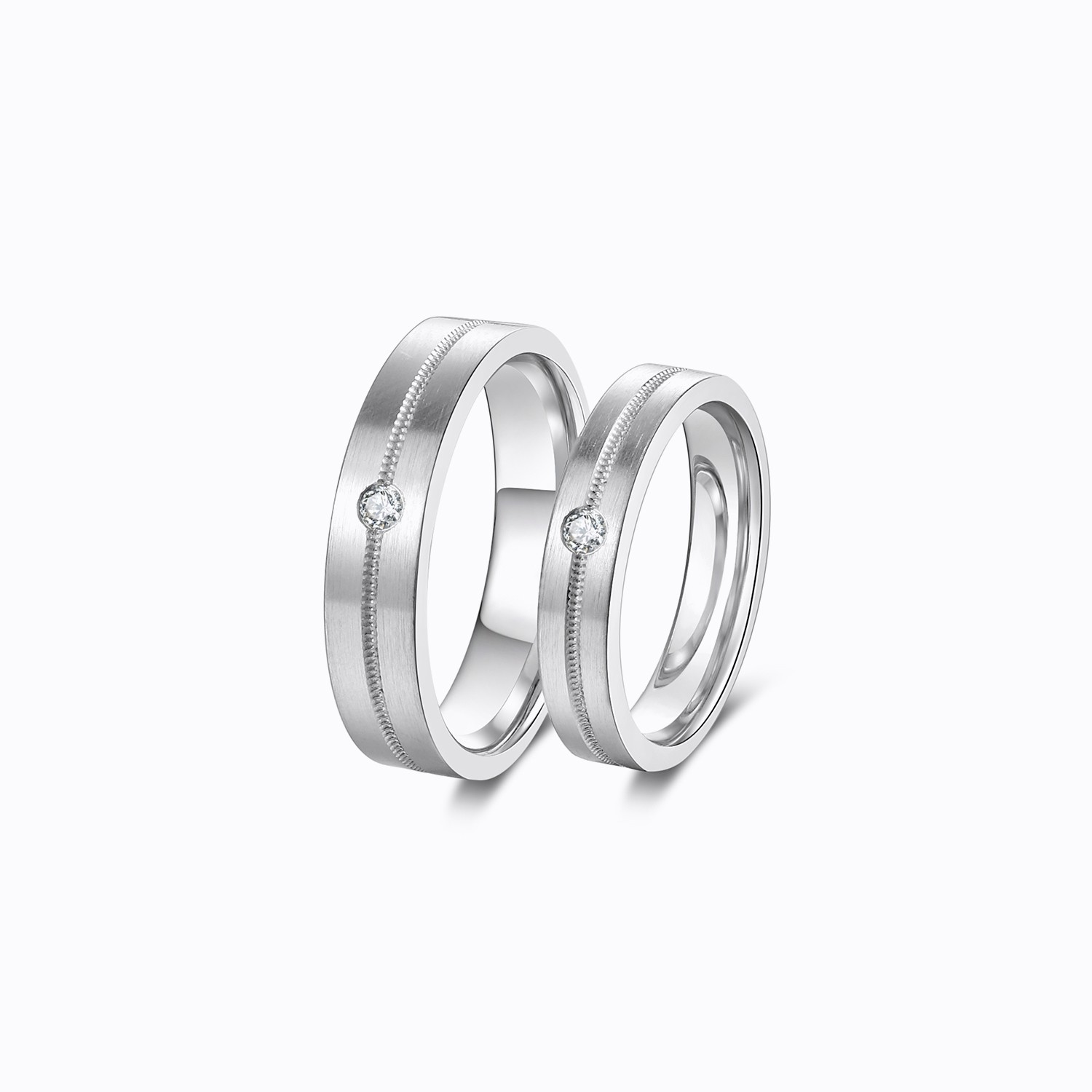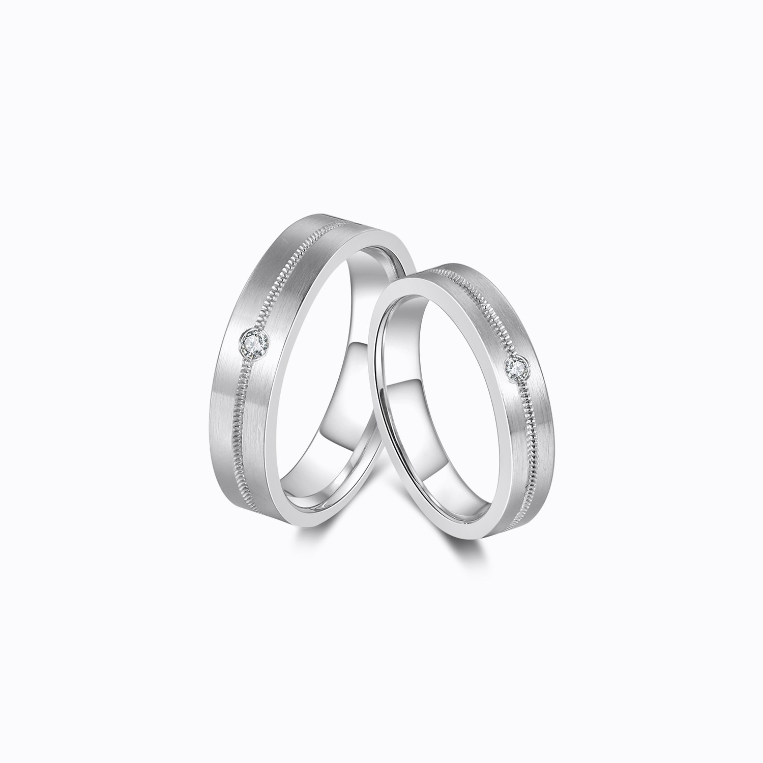Symbolize your love with these classic 18k white gold wedding bands, featuring subtle diamond accents for a touch of elegance. The sleek and timeless design makes these rings a perfect choice for couples who appreciate refined beauty and enduring style.