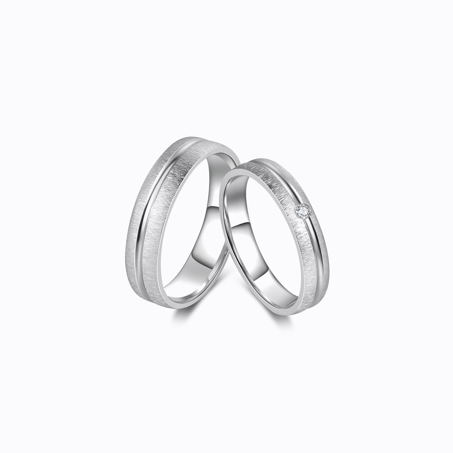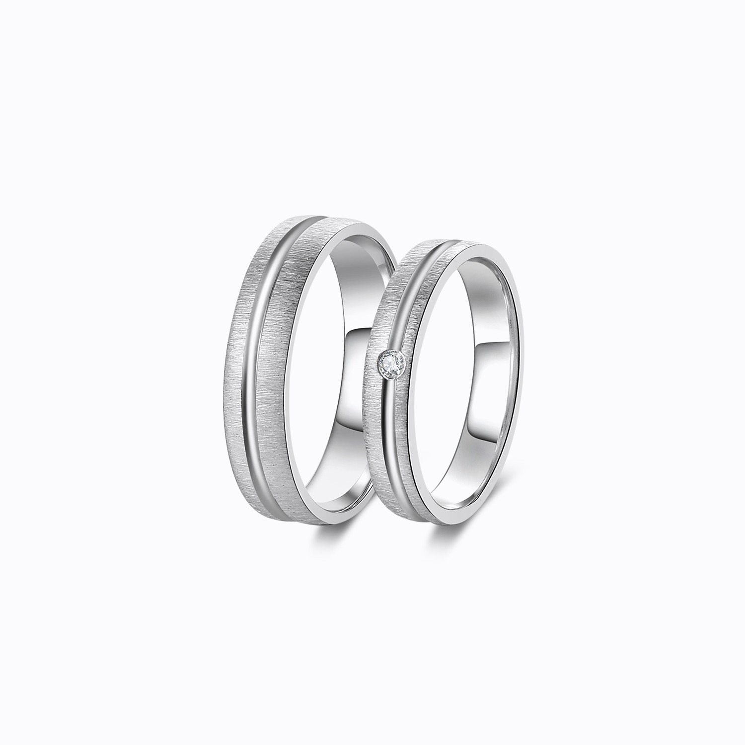 Indulge in the elegance of these 18k white gold couple rings, featuring a sophisticated textured finish and a sparkling diamond accent. These rings beautifully symbolize your timeless love and refined taste, perfect for celebrating your cherished bond.