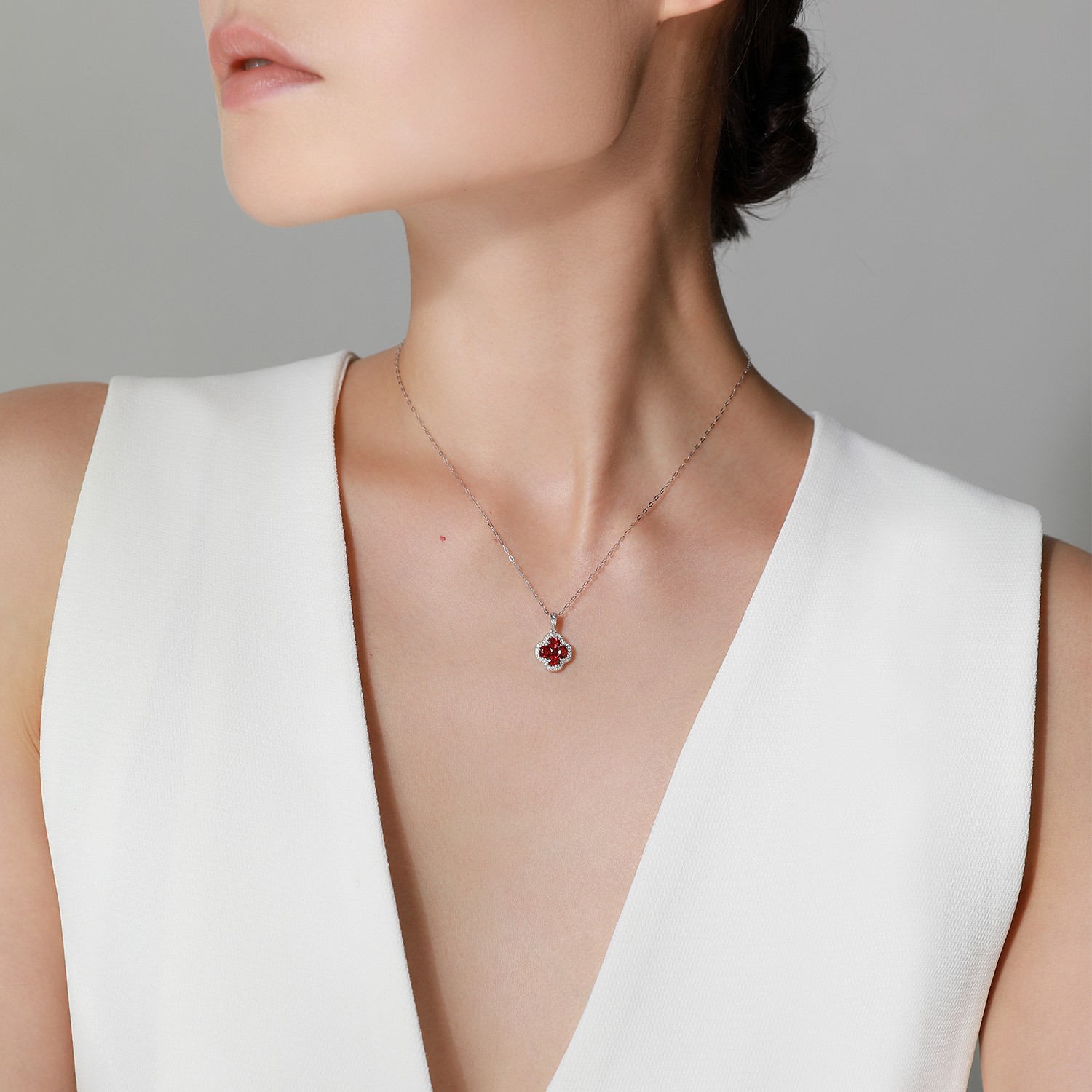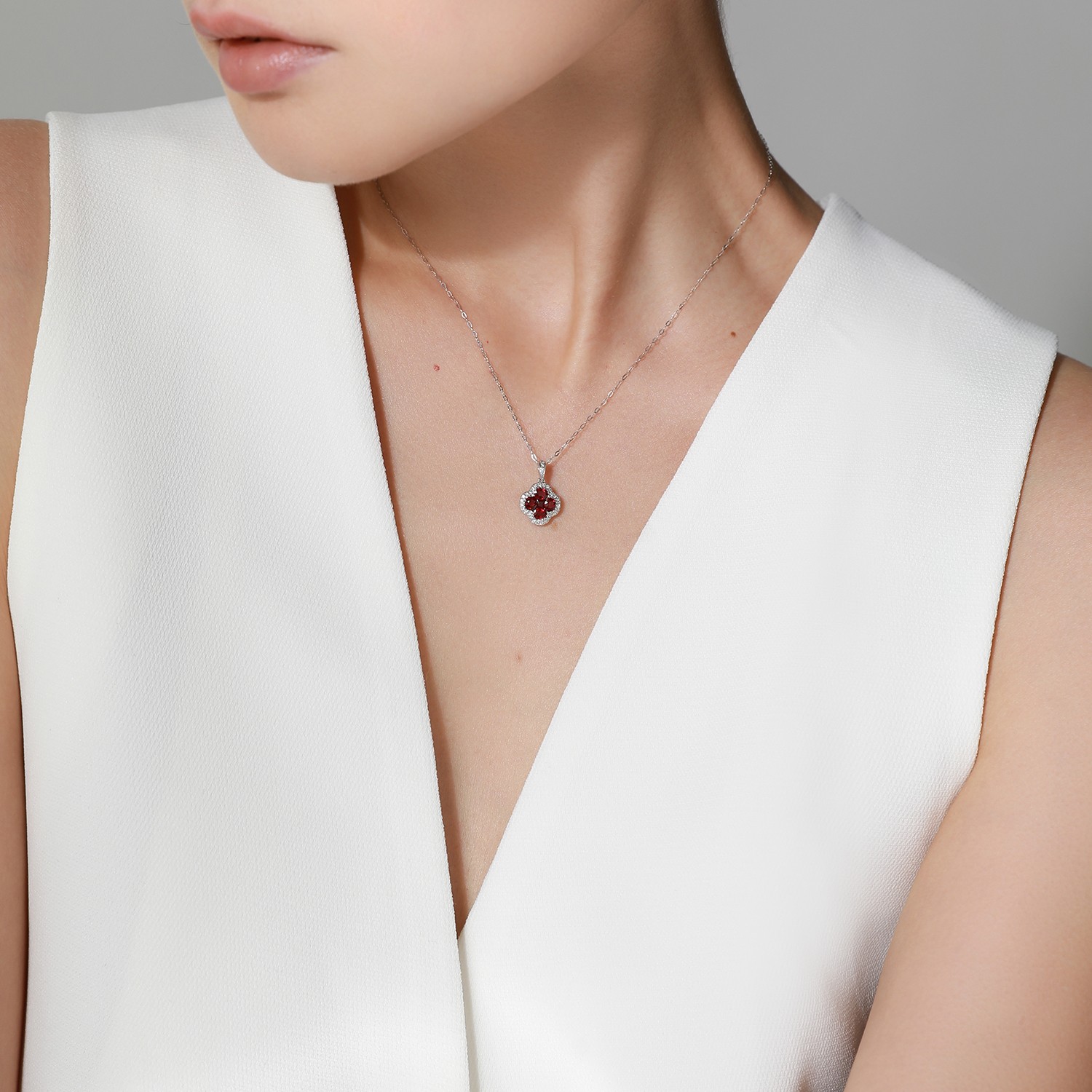 18K White Gold Ruby and Diamond Flower Pendant Necklace