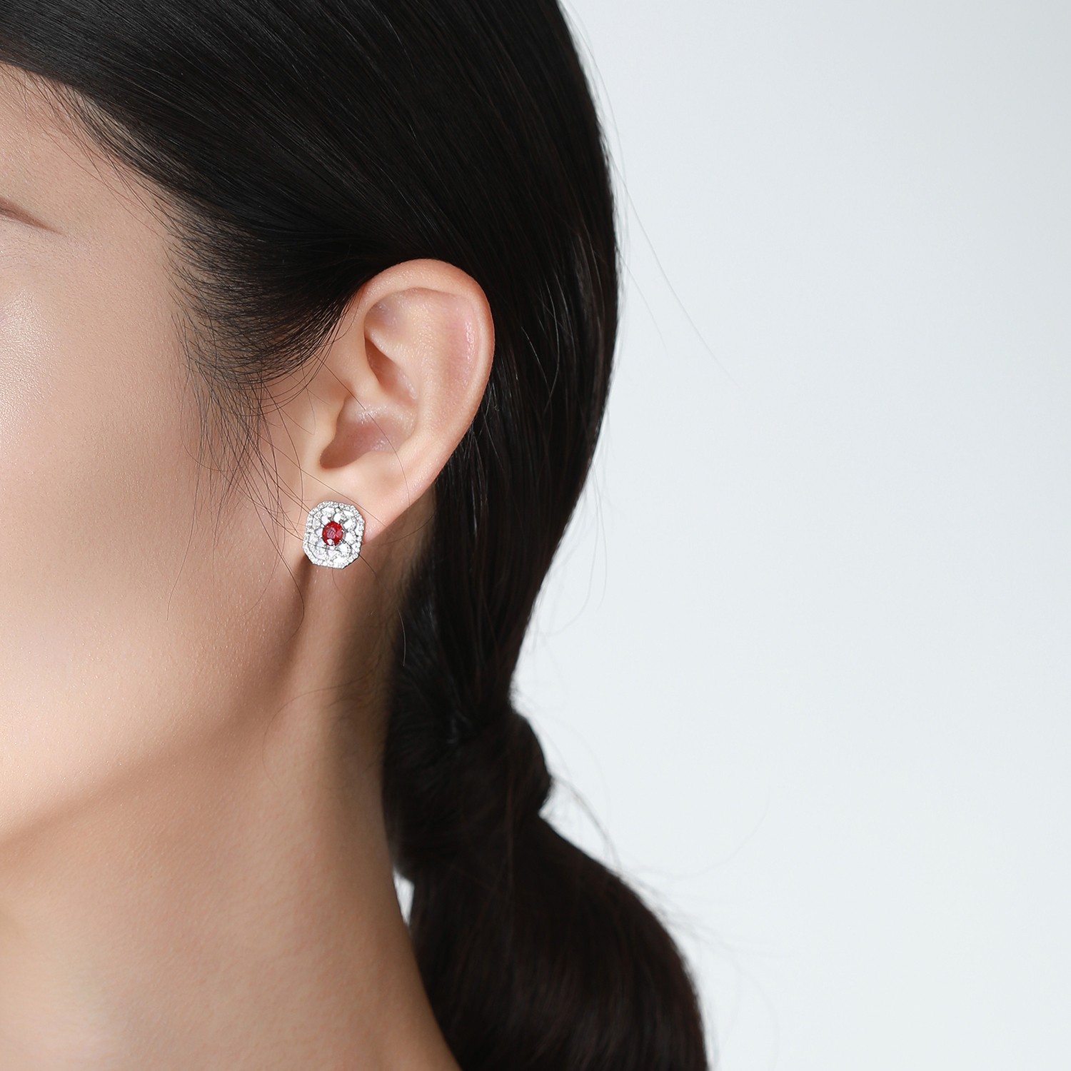 These stud earrings exude timeless elegance with their central red rubies wrapped in a halo of dazzling diamonds, all set in fine 18K white gold. The classic combination of rubies and diamonds offers a stunning display of luxury and grace, perfect for enhancing any attire with a touch of sophistication.