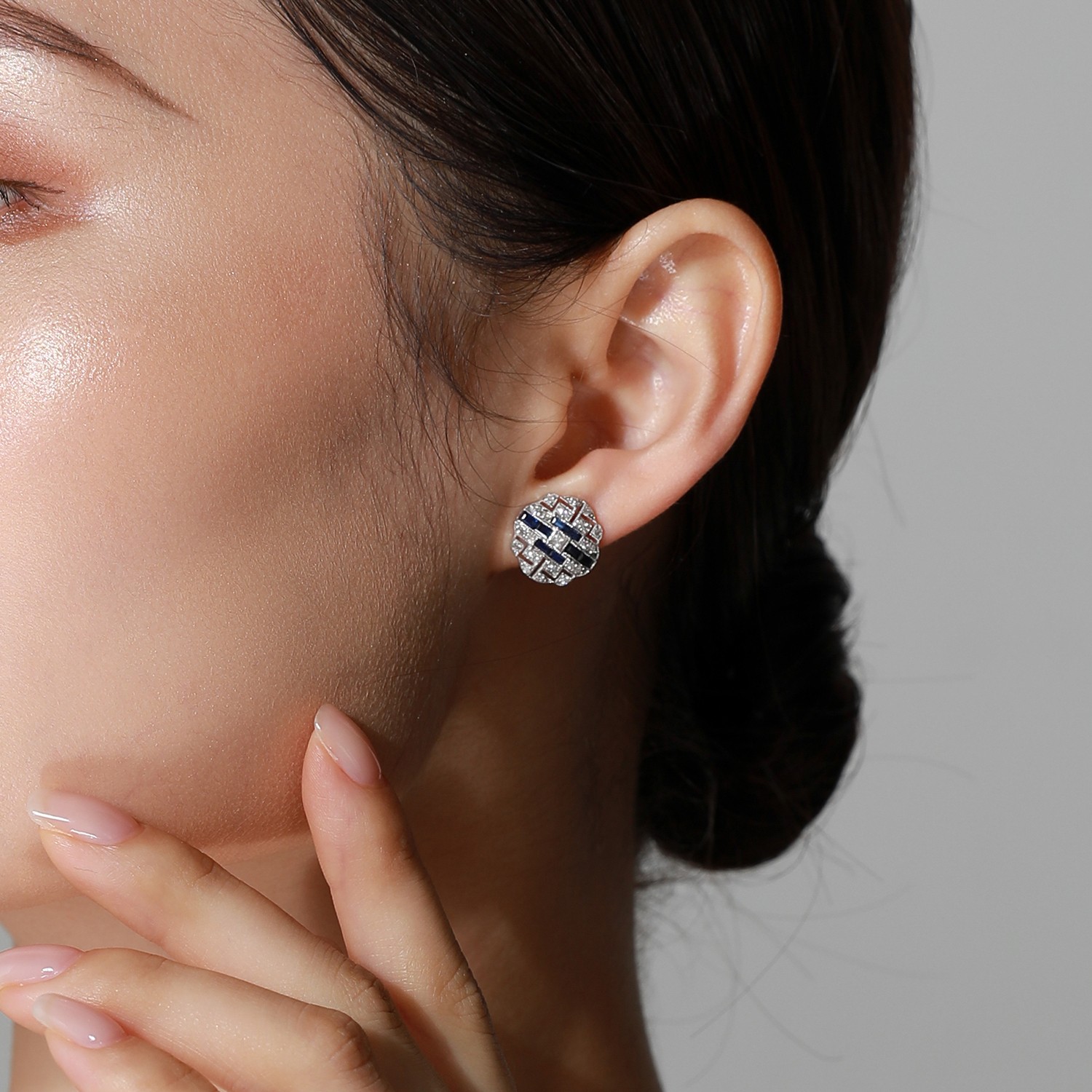 These stud earrings showcase a fine design crafted in 18K white gold, characterized by the aesthetic of geometric patterns and the inlaid sapphires and diamonds. The deep blue of the sapphires contrasts beautifully with the bright sparkle of the diamonds, presenting a perfect blend of elegance and modernity.