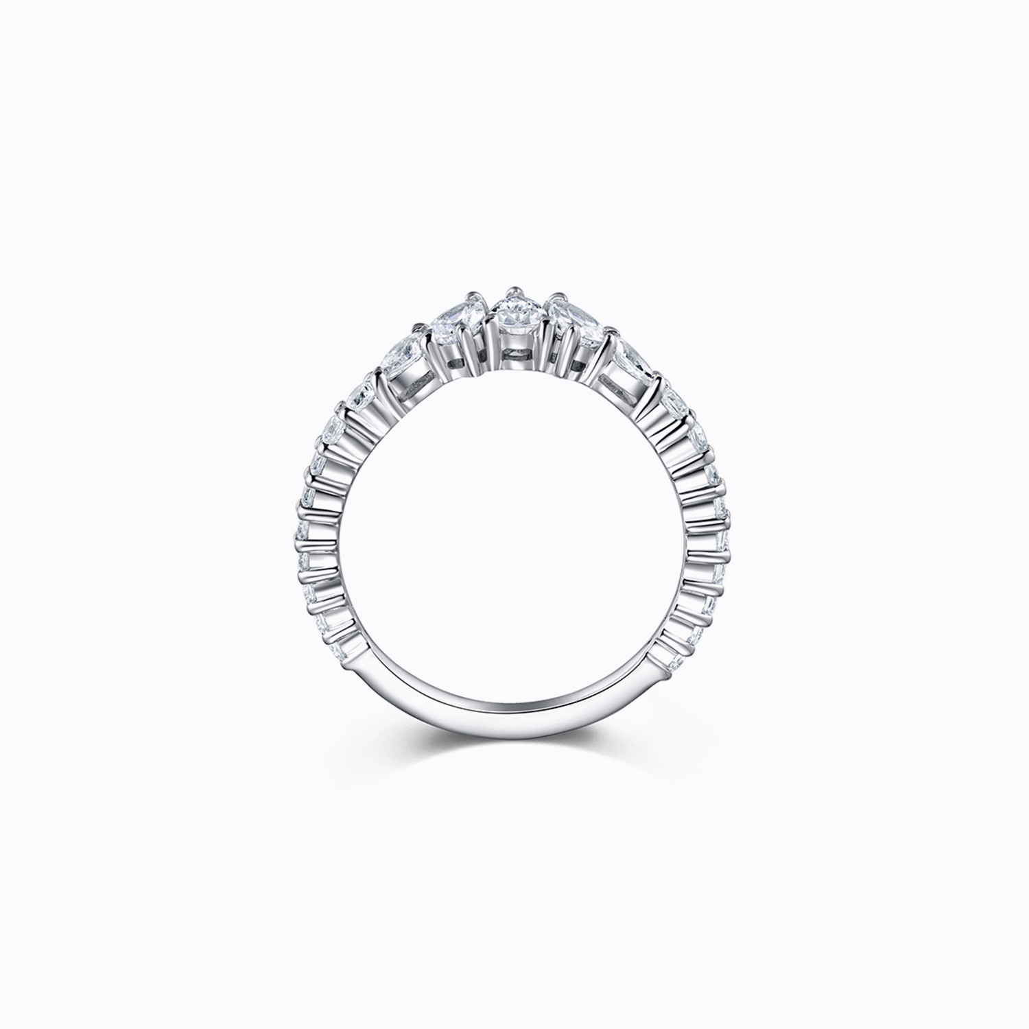 Crafted in 18K white gold, this stunning diamond band features a unique arrangement of triangle-cut diamonds, creating a striking and elegant design. This ring beautifully symbolizes your sophisticated style and timeless love, making it a perfect addition to any jewelry collection.