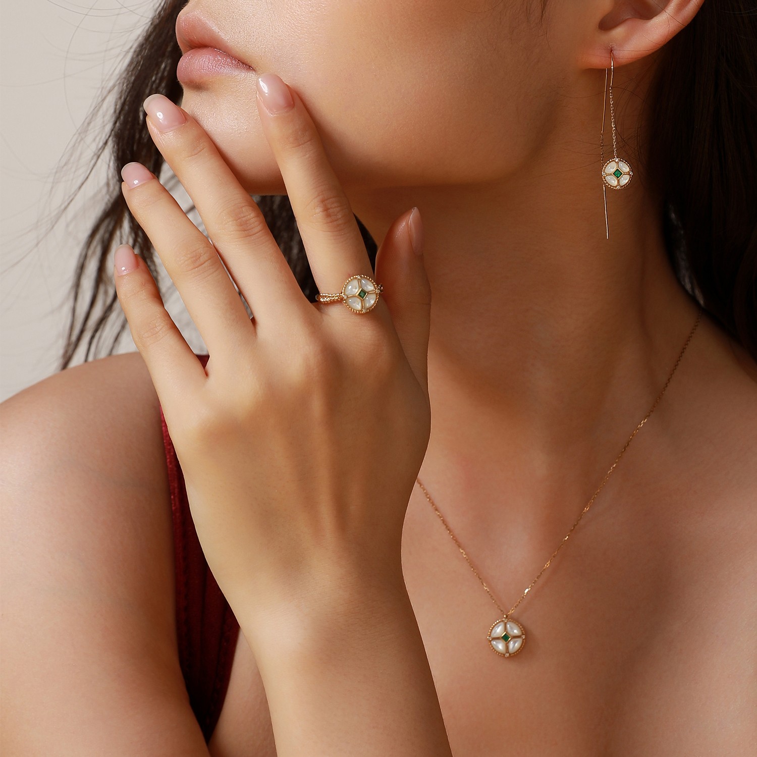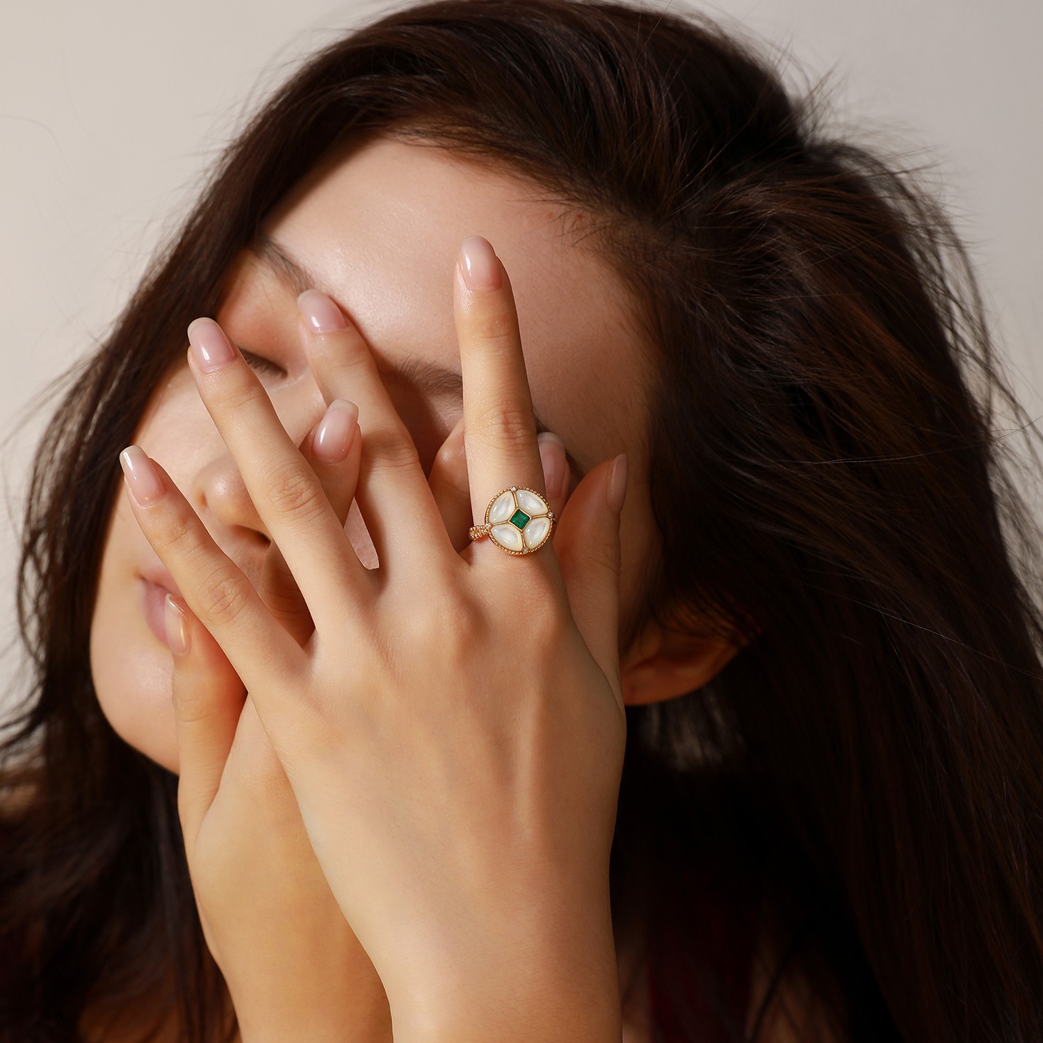 This ring features a base crafted from 18K yellow gold, ingeniously blending geometric style with natural elements. At its center lies a lustrous emerald, encircled by beautifully cut pieces of mother of pearl forming a chic symmetrical pattern. Small diamonds interspersed among the mother of pearl add a subtle sparkle to the overall design. This ring embodies the harmony of natural charm and contemporary design, making it an ideal choice for those who seek uniqueness and elegance.