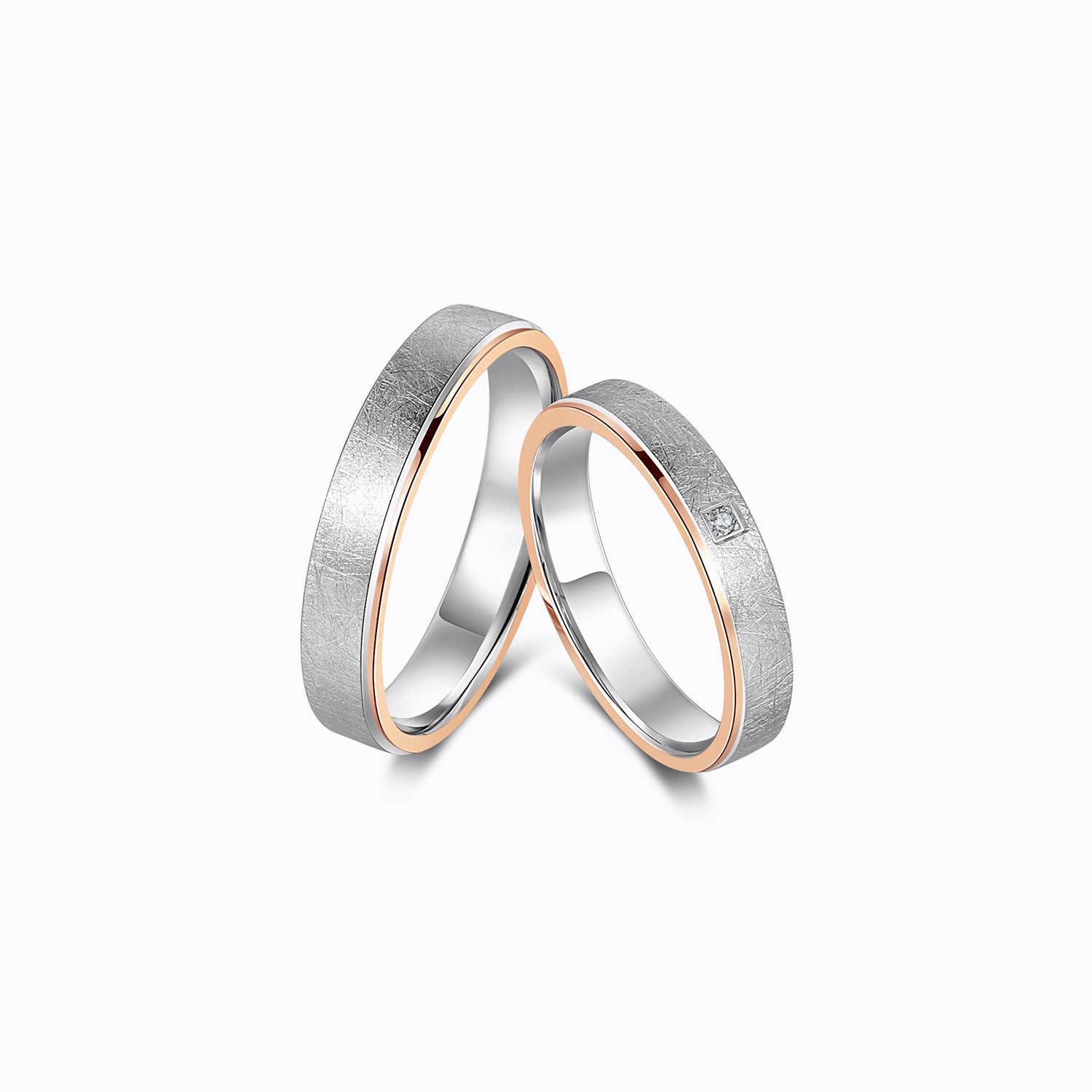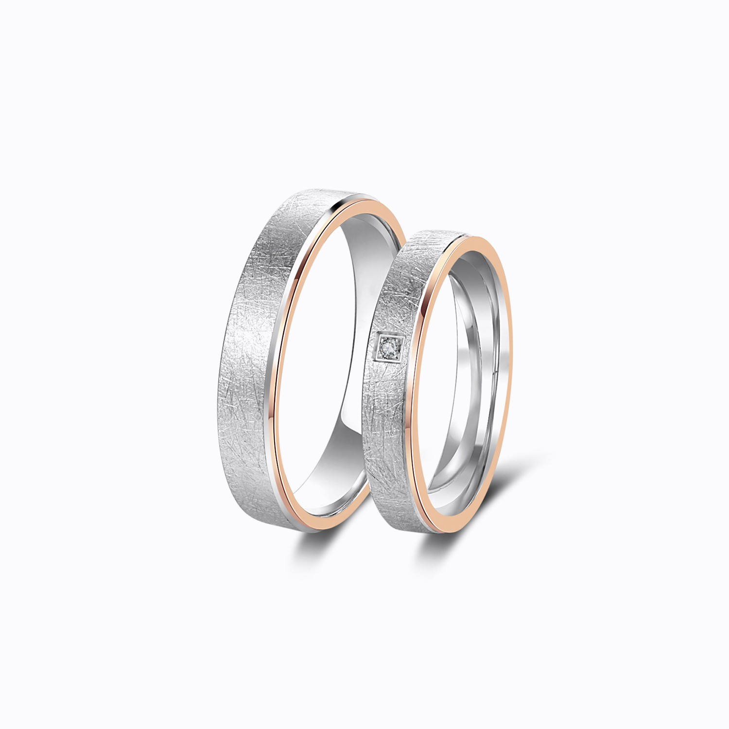 Celebrate your love with these exquisite couple rings, crafted in 18k white gold and 18k rose gold with a unique textured finish. These rings are a perfect blend of modern elegance and timeless charm, symbolizing your special and enduring bond.